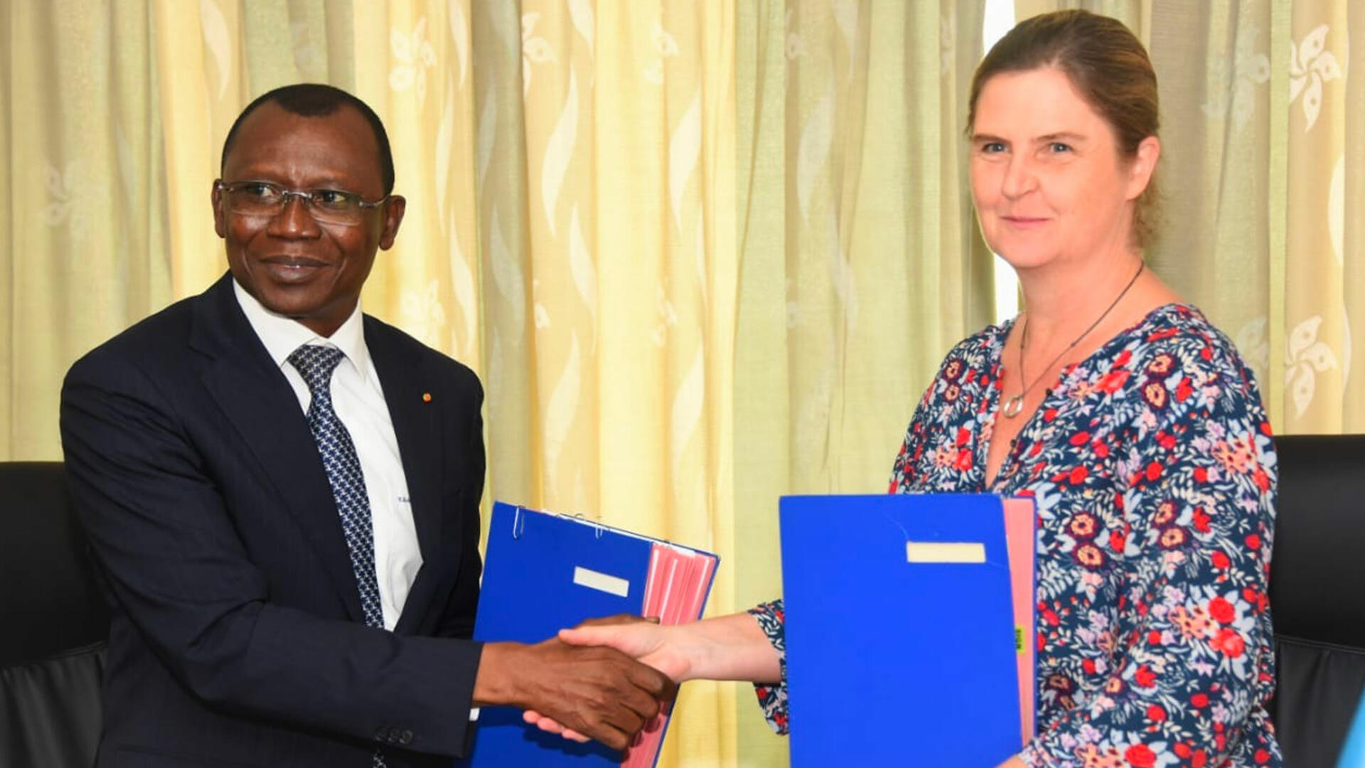 Accord signé entre Sani Yaya, le ministre de l’Economie et des Finances, et Coralie Gevers, directrice des opérations de la BM pour le Togo.