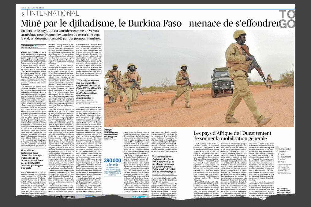 ‘L’inquiétude est plus particulièrement palpable chez les gouvernements des pays côtiers (Bénin, Togo, Ghana et Côte d’Ivoire), qui se sentent désormais sous la menace des milices islamistes. Le Burkina Faso, qui servait de tampon face aux djihadistes, apparaît aujourd’hui largement submergé, faisant de ces États une nouvelle ligne de front potentielle’, écrit l’envoyé spécial du journal.