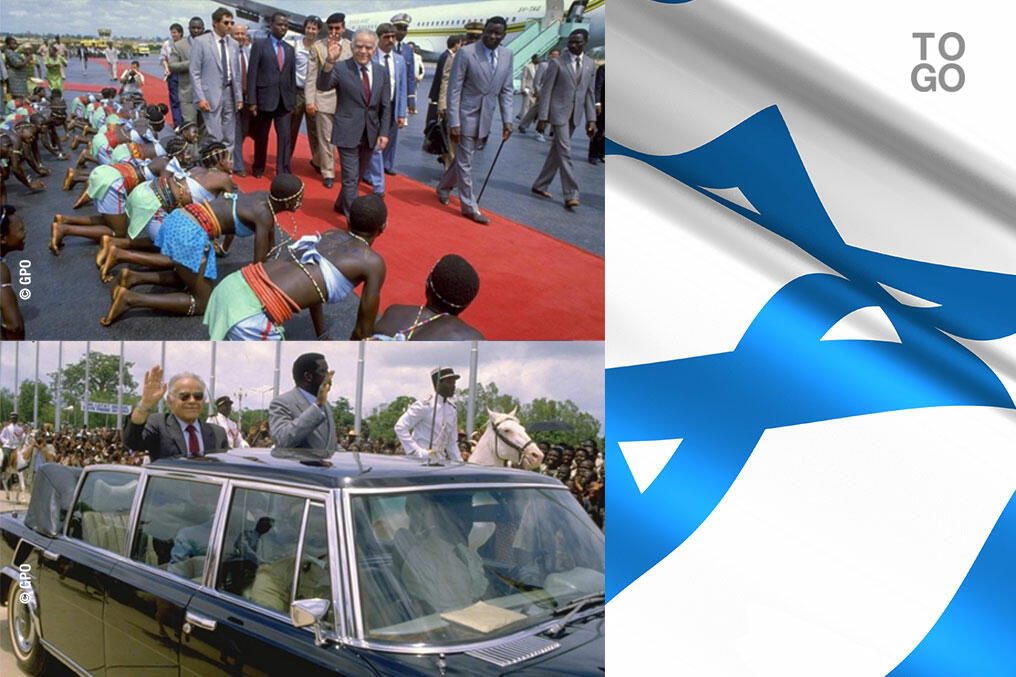 On y voit le Premier ministre de l’époque Yitzhak Shamir en juin 1987 à Lomé en compagnie du président Gnassingbé Eyadema à l’occasion du rétablissement des relations diplomatiques entre les deux pays.
