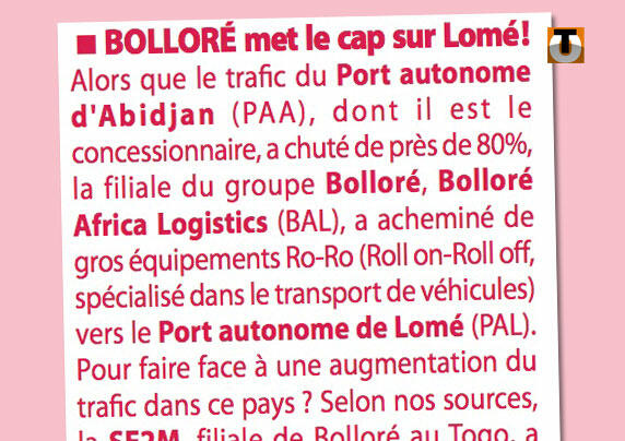 En raison de la chute d’activité au port d’Abidjan (-80%), le Groupe Bolloré met le cap sur Lomé, indique jeudi la Lettre du Continent (N°607).