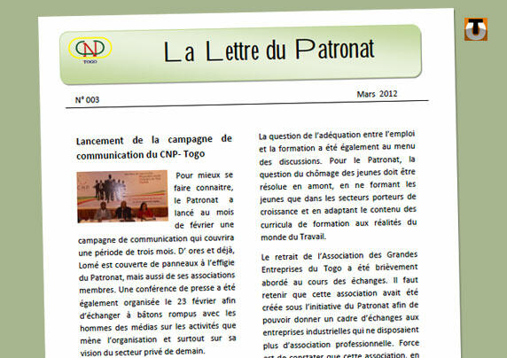 Le Conseil National du Patronat du Togo (CNPT) vient de sortir le 3e numéro de sa lettre d’information. Au sommaire, la nouvelle campagne de communication destinée à mieux faire connaître le rôle et la mission de cette organisation professionnelle. A lire également, le compte rendu d’une visite effectuée à Lomé par deux députés burkinabés qui souhaitaient savoir comment le CNPT participait à la relance de l’économie.