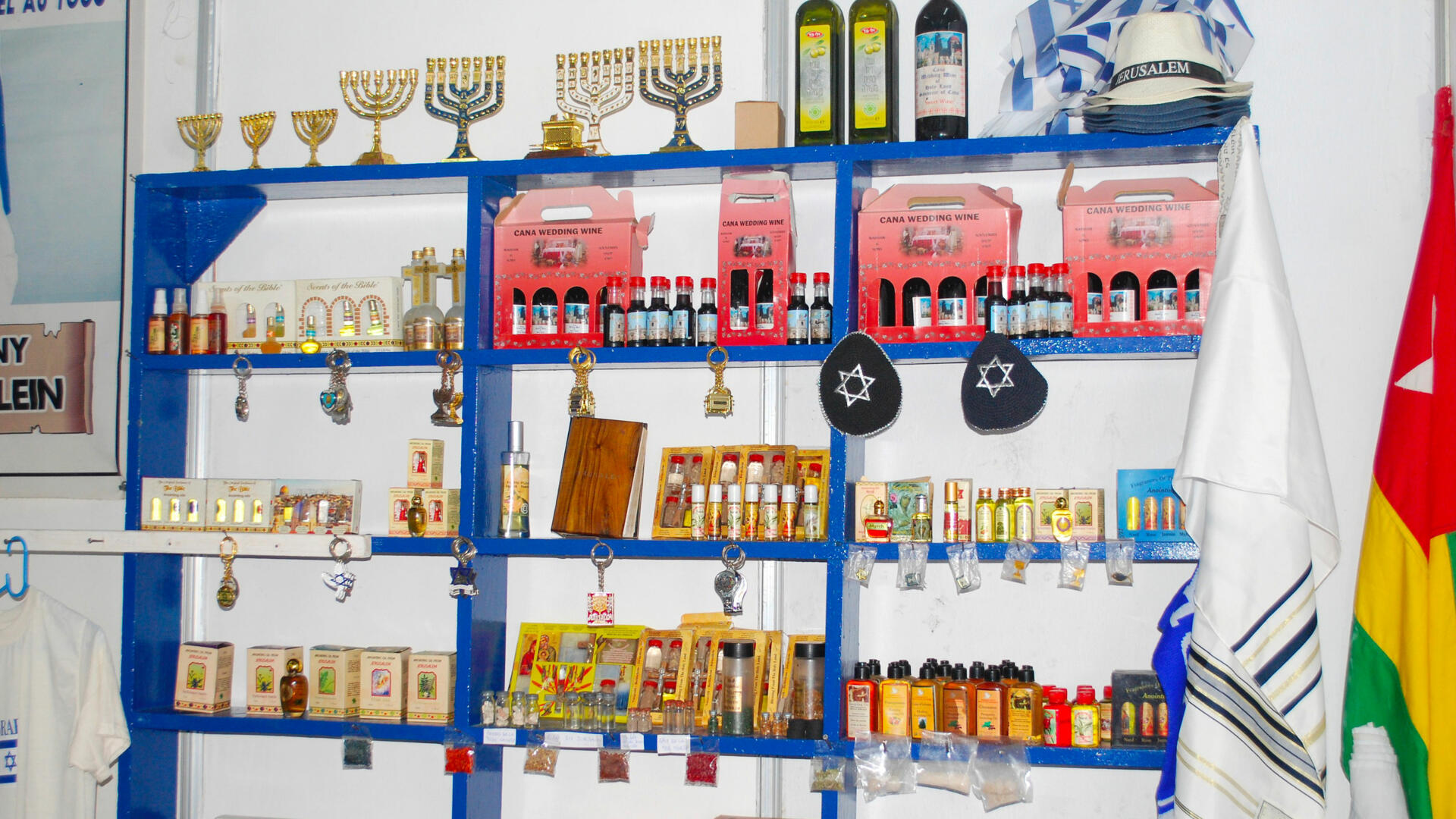 Dattes, eau bénite du Jourdain, produits cosmétique de la mer morte, vin de Cana, objets religieux sont exposés et vendus au public.