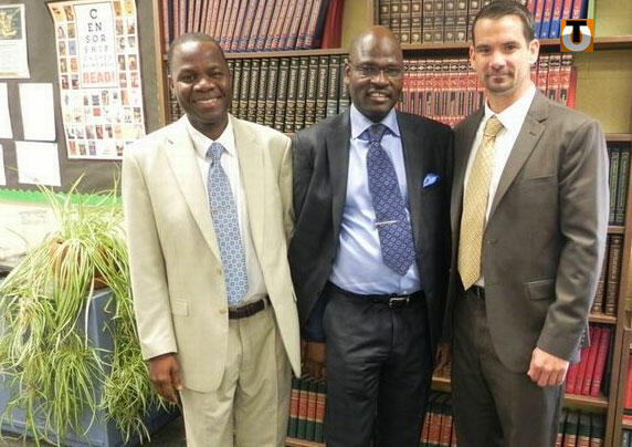 Photo : (de gauche à droite) Zato Kadambaya, le coordinateur des programmes de mathématique, Kadangha Limbiyé Bariki et le directeur de l’école, Tommy Thompson