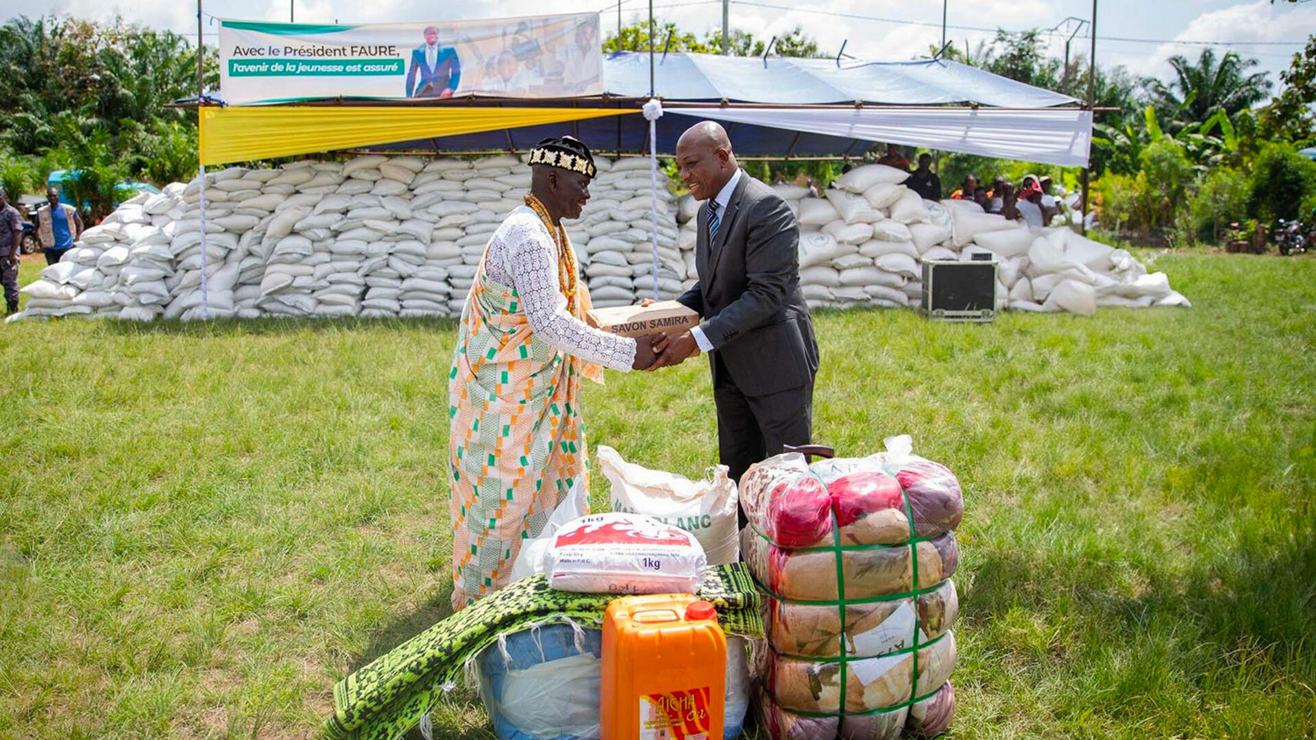 Des vivres et non-vivres ont été distribués aux sinistrés par Sandra Ablamba Johnson, ministre, secrétaire général de la présidence de la République, en présence de plusieurs membres du gouvernement ( Action sociale, Sécurité & Protection civile, Accès universel aux soins de santé).