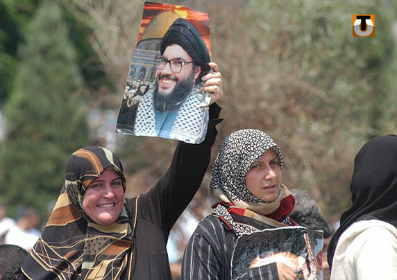 Photo : une femme brandissant le portrait de Hassan Nasrallah, chef du Hezbollah dont l’organisation est accusé d’avoir perpétré l’attentat contre Rafic Hariri