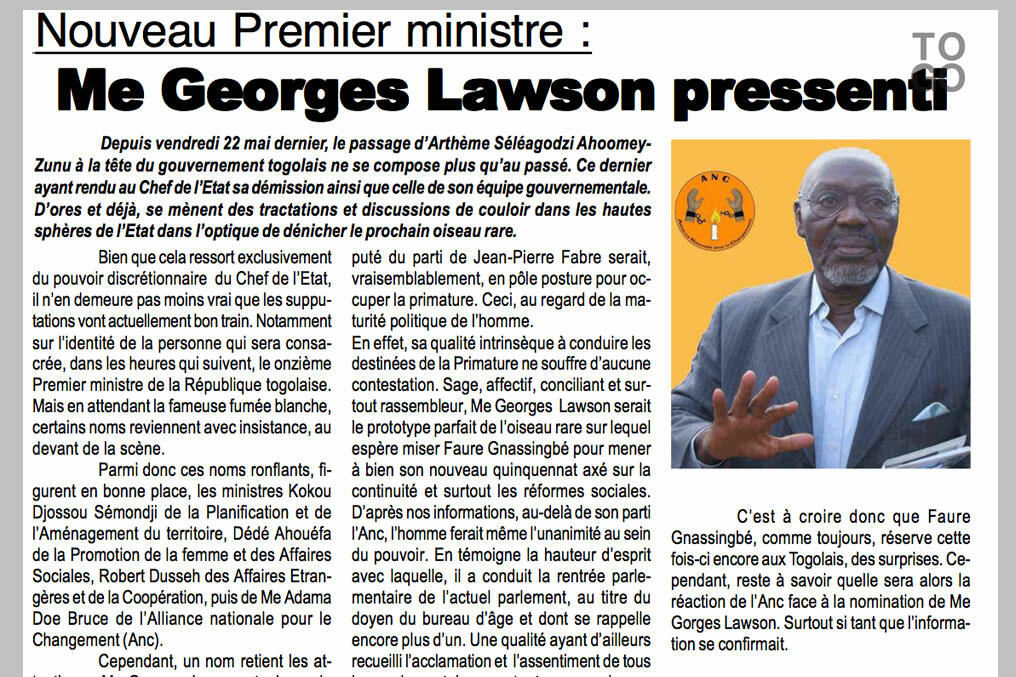‘Sage, affectif, conciliant et surtout rassembleur, Me Georges Lawson serait le prototype parfait de l’oiseau rare sur lequel espère miser Faure Gnassingbé pour mener à bien son nouveau quinquennat (…), peut-on lire jeudi dans Flambeau des Démocrates.
