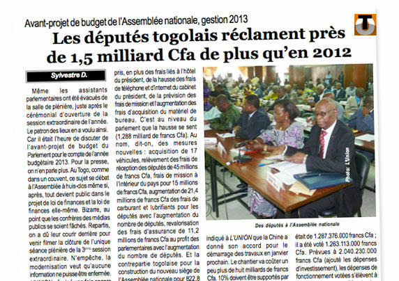 Le budget de l’Assemblée nationale devrait tourner autour de 5 milliards de Fcfa en 2013. L’Union, paru vendredi, indique que ce montant est supérieur d’un milliard à celui de cette année. Une hausse qui s’expliquerait par des frais de personnels de plus en plus importants.