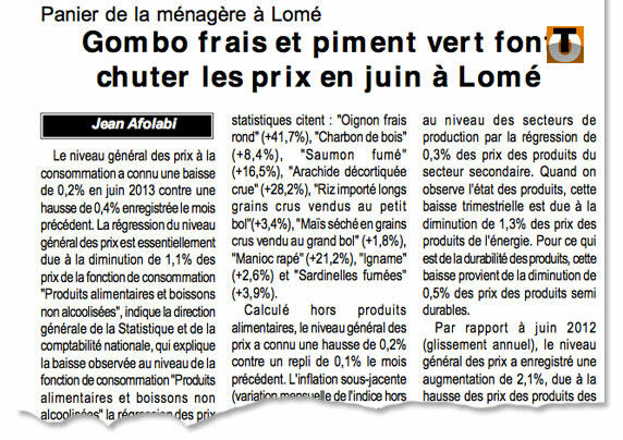 Le niveau général des prix à la consommation a connu une baisse de 0,2% en juin 2013 contre une hausse de 0,4% le mois précédent, indique mardi L’Union, citant les chiffres de la Direction générale de la Statistique et de la Comptabilité nationale.