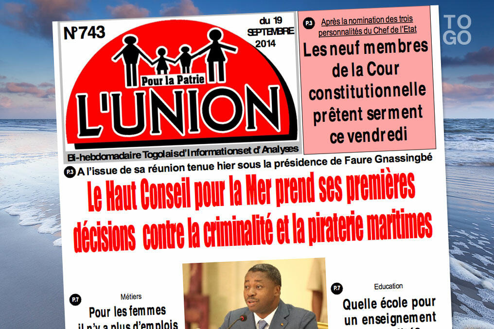 L’Union, en kiosque vendredi, revient très largement sur la création du Haut Conseil pour la Mer dont la mission est de lutter contre la piraterie maritime et les trafics d’armes et de drogue. La finalité est de protéger l’espace maritime togolais, de protéger l’environnement et de faire face à l’érosion côtière.