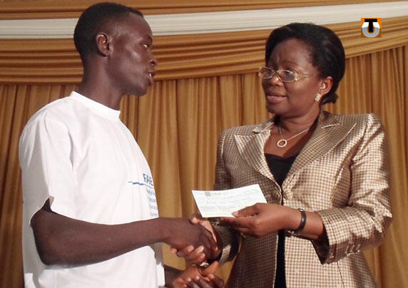 Photo : Victoire Dogbé-Tomegah remet un chèque à un jeune entrepreneur