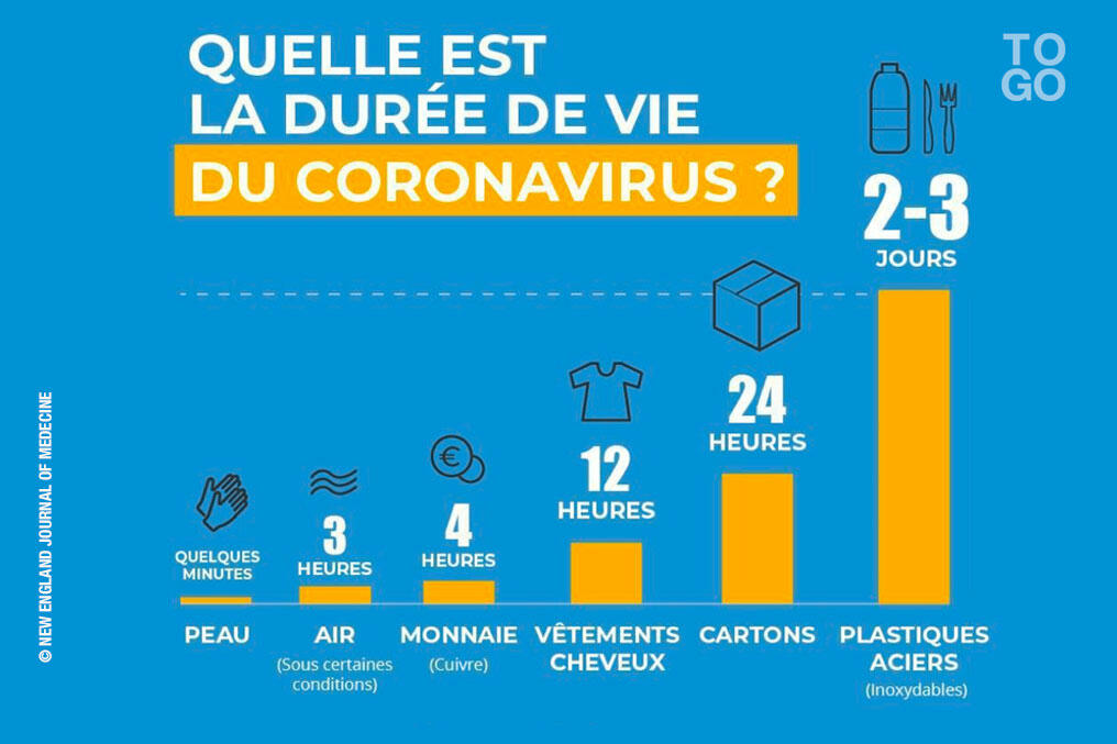 Le New England Journal of Medicine, révèle que le nouveau coronavirus résiste quelques minutes sur la peau, mais 12h sur les vêtements et les cheveux et jusqu’à 2 à 3 jours sur le plastique et l’acier.