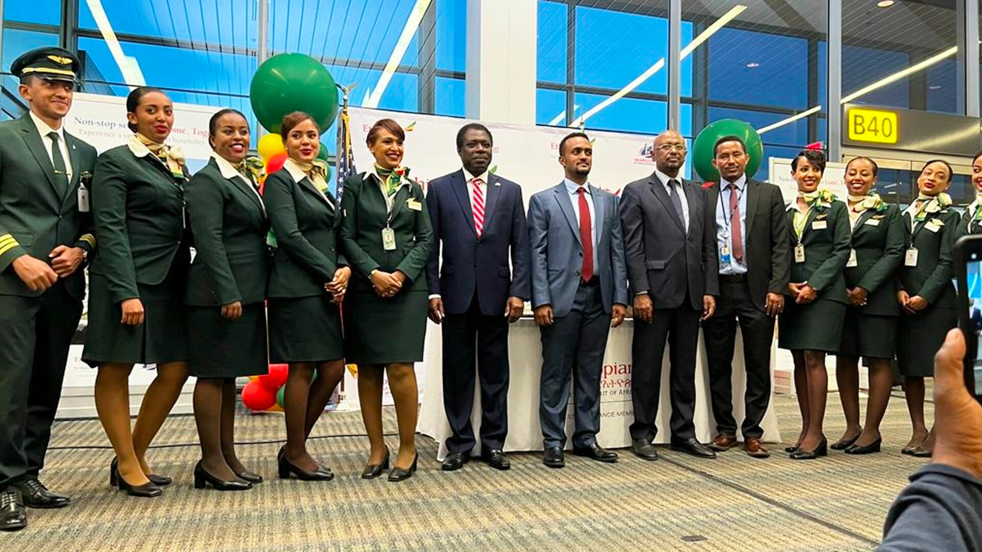 John E. Potter, le directeur exécutif de l'Autorité des aéroports de la région métropolitaine de Washington, l'ambassadeur d'Ethiopie aux Etats-Unis, Seleshi Bekele Awalachew, celui du Togo, Frédéric Edem Hegbe, et le directeur régional d’Ethiopian, Samson Arega, étaient sur le tarmac pour l’évènement.