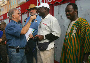 L'épreuve a été remportée par les frères Antonini sur Toyota HDJ 61 dans la catégorie 4 roues motrices. Honneur au Togo avec la victoire dans la catégorie 2 roues motrices de Mathieu Aquereburu. En photo : Mathieu Aquereburu répondant aux questions de la presse à son arrivée à St. Tropez; à sa droite, l'ambassadeur du Togo en France