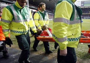 En photo : Adebayor évacué sur une civière dimanche dernier après sa blessure